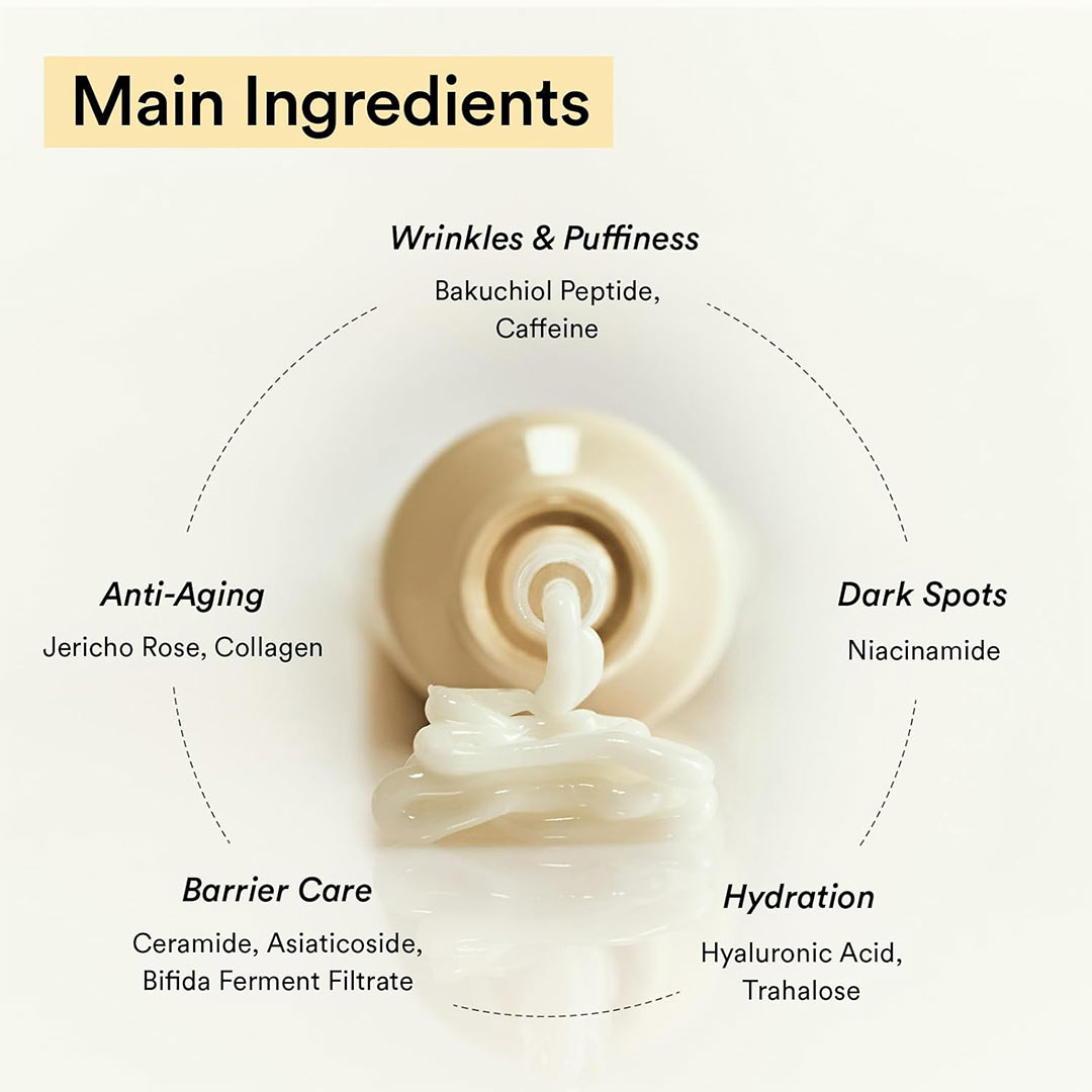 حاوی باکوچیول که تجدید سلولی را تحریک میکند و به طور قابل توجهی ظاهر خطوط ریز و چین و چروکهای پنجه کلاغی را کاهش میدهد