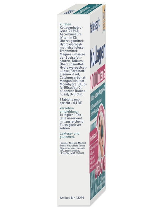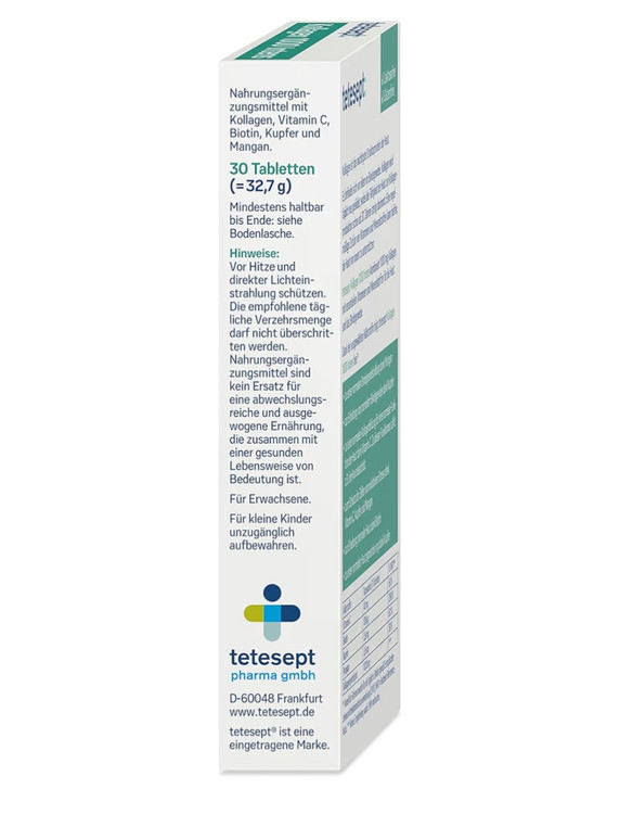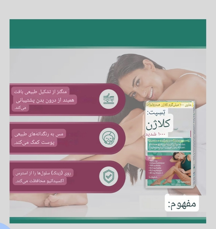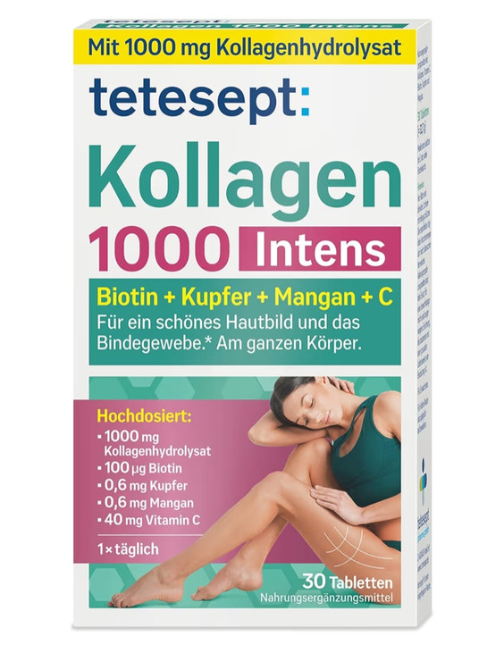 مکمل Tetesept Collagen 1000 Intens یک محصول تخصصی برای حمایت از سلامت پوست، بافت همبند، ناخنها و زیبایی کل بدن است. این مکمل با فرمول قدرتمندی شامل کلاژن هیدرولیز شده، ویتامین C، بیوتین، مس و منگنز تولید شده و به تقویت ساختار پوست از درون کمک میکند. بهویژه برای افرادی مناسب است که بهدنبال بهبود استحکام، شادابی و قوام پوست و کاهش نشانههای پیری هستند.