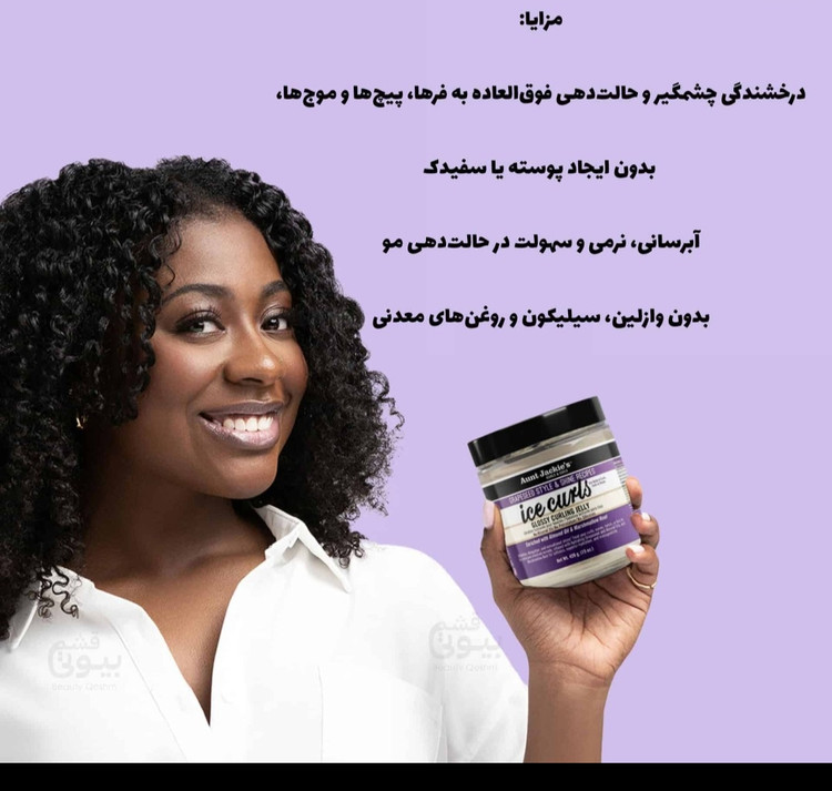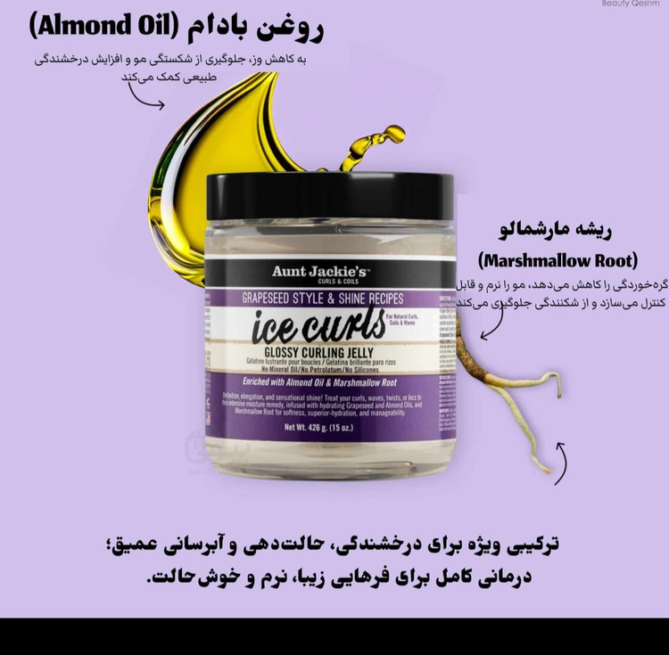 ژل حالتدهنده آنت جکیز مدل گریپسید آیس کرلز (Ice Curls Glossy Curling Jelly) (15 اونس / 426 گرم) از برند معتبر Aunt Jackie، محصولی تخصصی برای تعریف و تقویت موهای فر، موجدار و کویلی (انواع 2A تا 4C) است. این ژل با فرمولاسیون غنیشده با روغن دانه انگور، روغن بادام شیرین و ریشه ختمی، موها را عمیقاً آبرسانی کرده، نرمی و درخشندگی طبیعی ایجاد میکند و حالتدهی به موها را آسانتر میکند. این محصول وز مو را به حداقل رسانده، از کوتاه شدن موها (Shrinkage) جلوگیری کرده و نیاز به محصولات متعدد حالتدهنده را کاهش میدهد. مناسب برای روش Curly Girl Method (CGM) و بدون سولفات، پارابن و روغنهای معدنی.