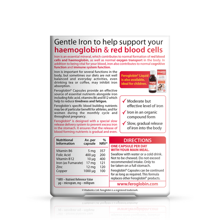 قرص/کپسول Feroglobin از برند معتبر Vitabiotics (انگلیس) یک مکمل غذایی آهندار با ویتامینها و عناصر معدنی است که بهویژه برای حمایت از سلامت خون، افزایش انرژی، و کاهش احساس خستگی طراحی شده است. این محصول با فرمولی کامل از آهن همراه با ویتامینهای گروه B، زینک و مس ساخته شده و از طریق عرضه آهسته (Slow Release) به جذب بهینه و ملایم کمک میکند.