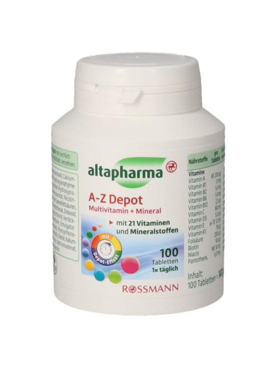 قرص مولتی ویتامین و مینرال A-Z Depot آلتافارما حاوی انواع ویتامینها، مواد معدنی و ریزمغدیهای موردنیاز برای تولید انرژی، بهبود سیستم ایمنی و تقویت عمومی بدن است و به صورت تدریجی (دپو) جذب خواهد شد